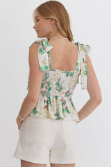 Floral print sweetheart neck sleeveless peplum top featuring smocking at top. Adjustable straps. Unlined. Knit. Non-sheer. Lightweight.