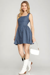 Denim dress with white stars printed on it. This flirty dress is double lined, has a fitted look and runs true to size.