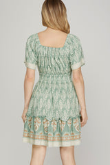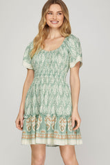 Adorable printed mini dress with BELL sleeves and an elastic wasit.