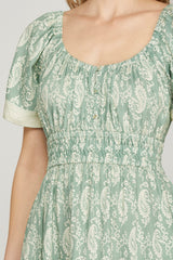 This dress has an all over floral print in a sage color with front pockets and a button detail.