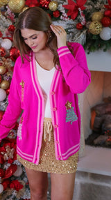Adorable, bright pink cardigan with sequin tree detailing, and a relaxed fit.