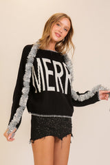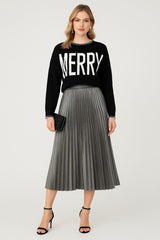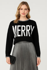 Bring joy to your winter wardrobe with this festive "MERRY" intarsia knit sweater. Designed for comfort and cheer, this standout piece features bold lettering across the front and charming contrast whipstitch detailing along the neckline, cuffs, and hem. The relaxed silhouette and soft knit fabric make it a cozy yet statement-making addition-perfect for holiday parties, casual gatherings, or spreading seasonal spirit all season long.