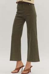 Solid high rise wide leg pants featuring front seam detail. Back patch pockets. Zip-fly button closure. Unlined. Woven. Non-sheer. Lightweight.
