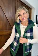 Sherpa vest with a plaid print and the perfect colorings for the holiday season.