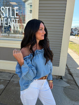 Chambray top with the cutest ruffled detail along the top. This flirty top styles great with white denim