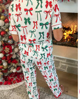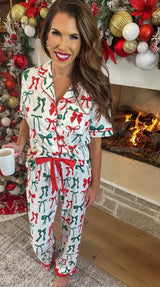 The top has a button up style fit and the bottoms have an elastic waist with a drawstring.