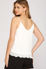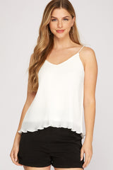 Fun and flirty off white tank with adjustable straps, a pleated material and cami fit.