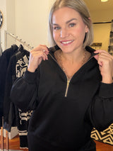 Theyop has a half zip with a gold zipper. The bottoms have an elastic waist, pockets and a straight leg fit.