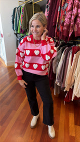 Ladies take a look at this adorable heart striped sweater. Pink and red stripes with hearts on this sweater top. Great for Valentine's day or hanging with the girls.