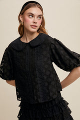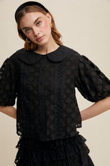 Embroidered Peter pan collared blouse with puffed sleeves.