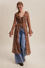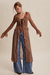 Long sleeved lace drapey tie front kimono.