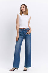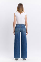 Comfort stretch denim Lovervet jeans. High-Rise jeans with a clean cut raw hem. Full length, Wide-leg jeans.