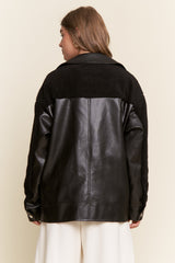 Black moxed fabric snap button jacket. Faux leather with Sherpa Teddy on the sleeves and shoulders. Great for any night out.