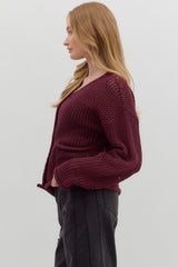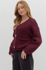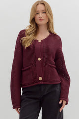 Solid open sweater knit long sleeve cardigan featuring gold accent oversized button. Front pockets. Unlined. Knit. Sheer. Lightweight.