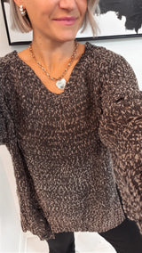 Loose, relaxed fit Pullover sweater. Has a wide round neck. Distressed detail with wide folded sleeves.