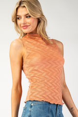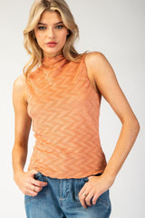 Textured sleeveless tank top featuring a scalloped mock neck, a scalloped bottom hem, is a slightly fitted body and is the perfect piece to layer over during the transitioning seasons!