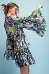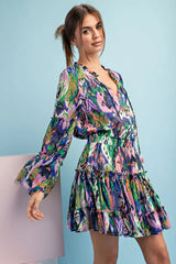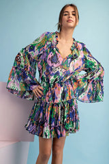 Beautiful printed long sleeve mini dress featuring a ruffled v-neckline with a front tie closure.Has a smocked waistline, a ruffled and tiered body, with bell sleeves and is lined.