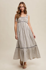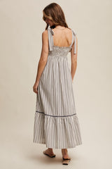 Striped tie shoulder dress with an all over striped print. This one has a ivory and charcoal coloring with a maxi style fit.