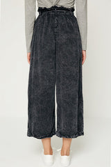 All over charcoal gray mineral washed trouser bottom with a front tie, elastic waist and front pockets.