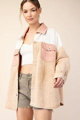 Mineral washed color block jacket featuring a button down front, a collared neckline, two chest pockets, buttoned cuffs and an added pleat in the back for detail.