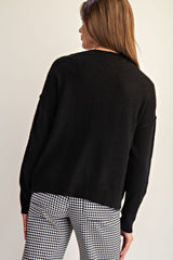 This festive pullover sweater features a soft knit body with dropped shoulders and ribbed trims, highlighted by delicate gold beading that spells out "cheers" and finishes with a martini glass motif for a celebratory touch.