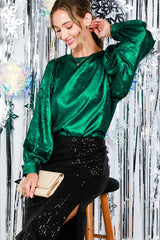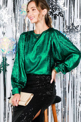 Gorgeous Hunter Green Metallic woven blouse with balloon sleeves. Round neck line with button closure around the wrist and an alluring button detail on the back.