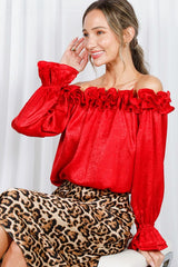 Pleated ruffle off the shoulder, metallic blouse. Perfect for an elegant evening out. Available in a beautiful red color.