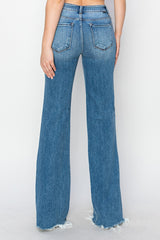 Risen- Tummy Control, mid rise wide leg Jeans are great for any day. Distress on the pockets and the hem line. Comes in a medium blue denim color.