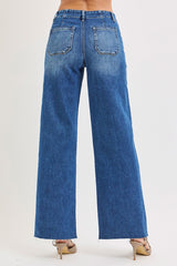 If your looking for a wide leg jeans these are it! Keep up with the trends with these Risen- Slouchy wide leg, with front patch pocket detail, raw hem line and button closure.