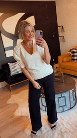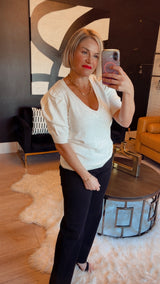 The All Your's Sweater comes In black or white. This sweater has a v-neckline, flirty puffed sleeves and runs true to size.