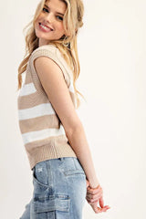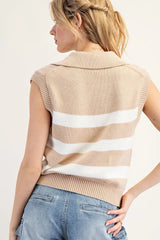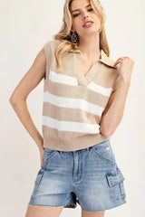 This striped sleeveless sweater vest showcases a structured knit fabrication, a bold contrast stripe pattern, a sharp V-neckline with a chic fold over collar. Has ribbed armholes and hem for a tailored fit, and a cropped silhouette for a modern yet preppy look.