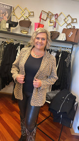 Denim blazer with a single button closure, shoulder pads and styles great with denim, black bottoms or faux leather leggings.