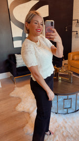 Beautiful cream colored top with short sleeves, round neck and an all over crochet textured look. Style with denim, black jeans or a skirt.
