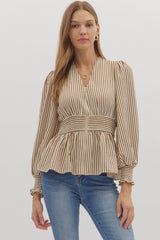 Stripe print long sleeve peplum top featuring smocked waistband and V-neck. Zipper closure at front. Smocked cuffs with ruffle trim. Unlined. Woven. Non-sheer. Lightweight.