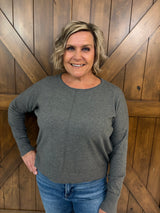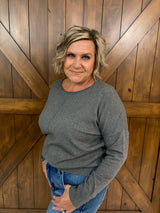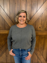 The Elsie Round neck sweater comes in charcoal or bright red. Both have a super soft and comfortable material with a good amount of stretch.