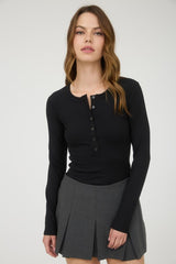 These long sleeved microribbed tops have button details along the front and a fitted fit. These are created with a polyester spandex blend.