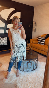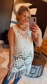 Adorable crochet top with fringe bottom. Wear as a bathing suit cover up, over shorts or with denim.