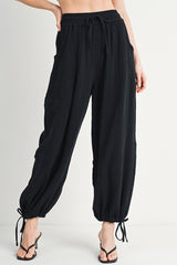 Adorable lightweight jogger style pant. These have a harem drawstring look with bow details along the bottom.