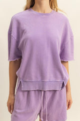 The top has a raw hemline along the arm sleeves, ribbed detailing along the hem and a relaxed style fit.