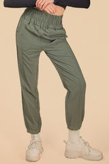 Army green joggers with a thick elastic waistband and jogger style fit.
