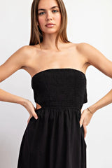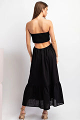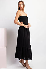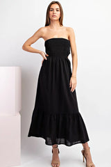 Take a look at this: Sleeveless midi dress featuring a smocked bodice, open back design, and a tiered hem. Ready for fun and going out.