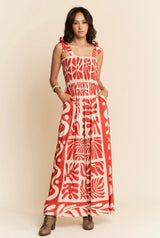 This funky jumpsuit has an all over red and ivory abstract print, adjustable straps and a rouched fabric along the chest.