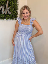Classic blue and ivory striped mid length dress.
