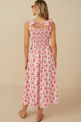 Check out this stunning floral cutout tank dress. This dress has a flowy ruffle detail and adorable floral knit fabric. Has a smocked waist, with peek a boo sides, pockets and a back tie closure.