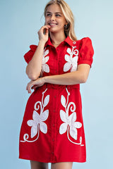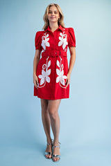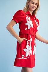Absolutely stunning red and ivory linen dress with a collared neckline, front pockets, floral embroidered print and belt.