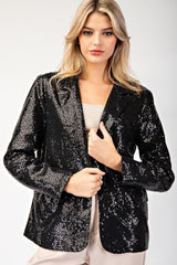 Shiny glitter long sleeve blazer jacket featuring a lapel collar, two side flap pockets, one button down front closure and is lined.