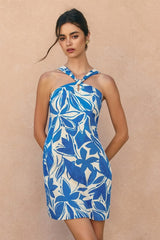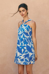 Such a pretty two tone floral cotton poplin mini dress. Has halter neck tie, with center front keyhole and knot detail. Eyelet hole for halter strap to pull through and tie closure on the back. Side zipper closure, no elastic band or pockets. Fully lined dress with a smocking fit that is comfortable.