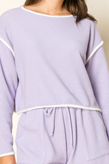This top has a front chest packet, relaxed style, fit, and coordinates perfectly with our lavender bottoms.
