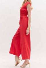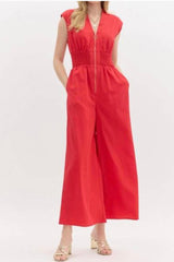 Solid v-neck sleeveless wide leg jumpsuit featuring zipper closure at front.