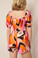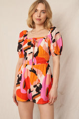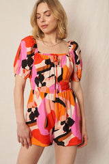 Bright and bold short romper with a mix of colors and an abstract design. This one has bubble sleeves and cinches in the waist.